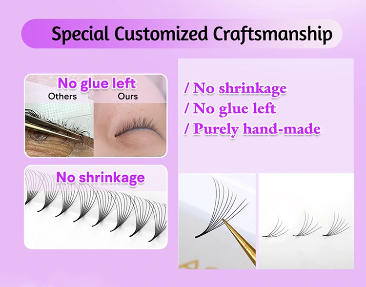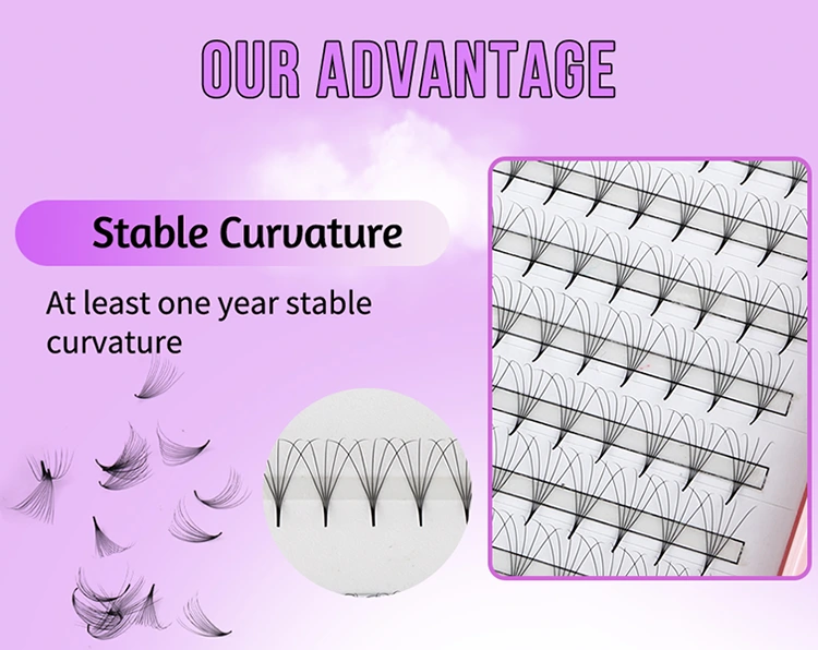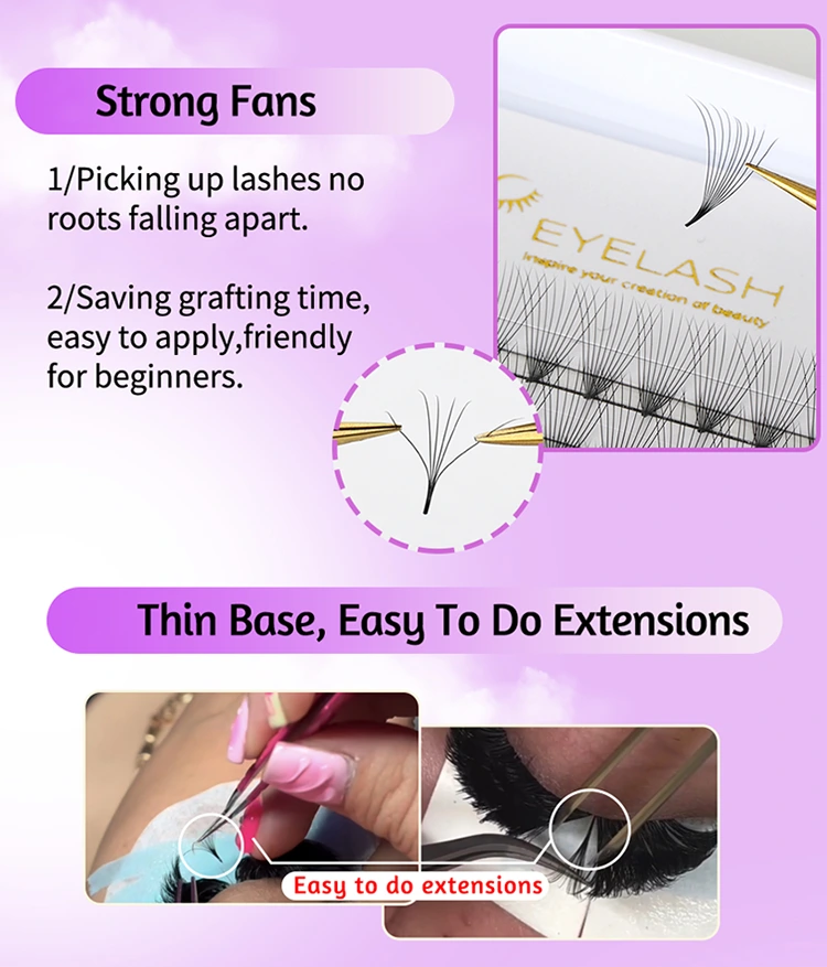 Ohut pohja ja parempi retentio: Kaikilla esivalmistetuilla tuulettimilla on ohut pohja, joten niiden levittäminen on helppoa ilman lisäliimaa. Ohut ja terävä pohjamalli voi paremmin peittää luonnolliset ripset ilman aukkoja, varmistaen saumattoman sitoutumisen liiman ja väärien ripsien välillä. Tämä tekee vääristä ripsistä pidempään kestävän, mikä tarjoaa asiakkaille mukavuutta ja kestävyyttä. Ohut pohja tekee sovellusprosessista myös tehokkaamman ja vähentää jokaiselle sarjalle tarvittavaa aikaa.